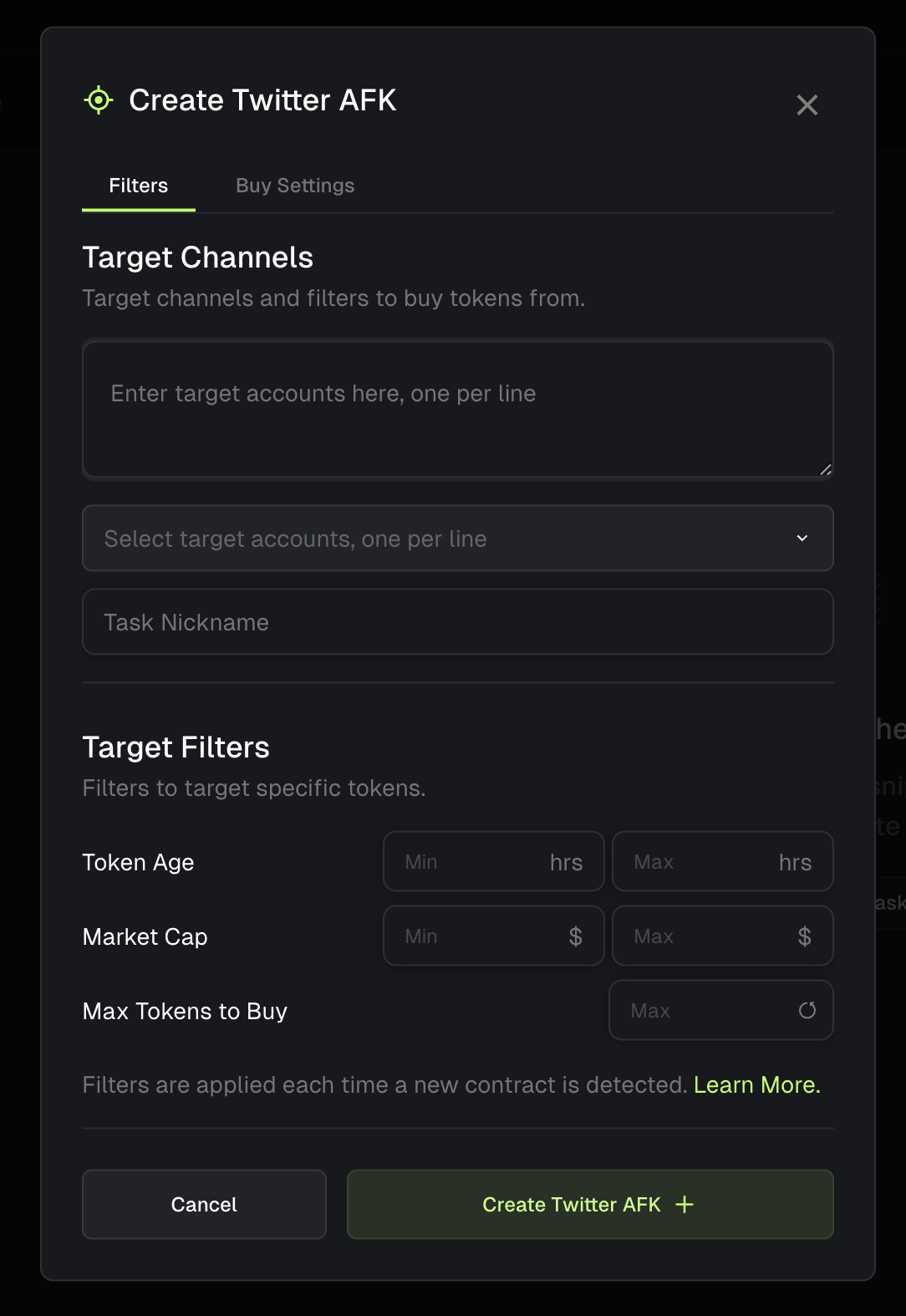 | Max Tokens to Buy | The maximum number of unique token contracts the task will buy. After the max has been hit, the task will stop running. |